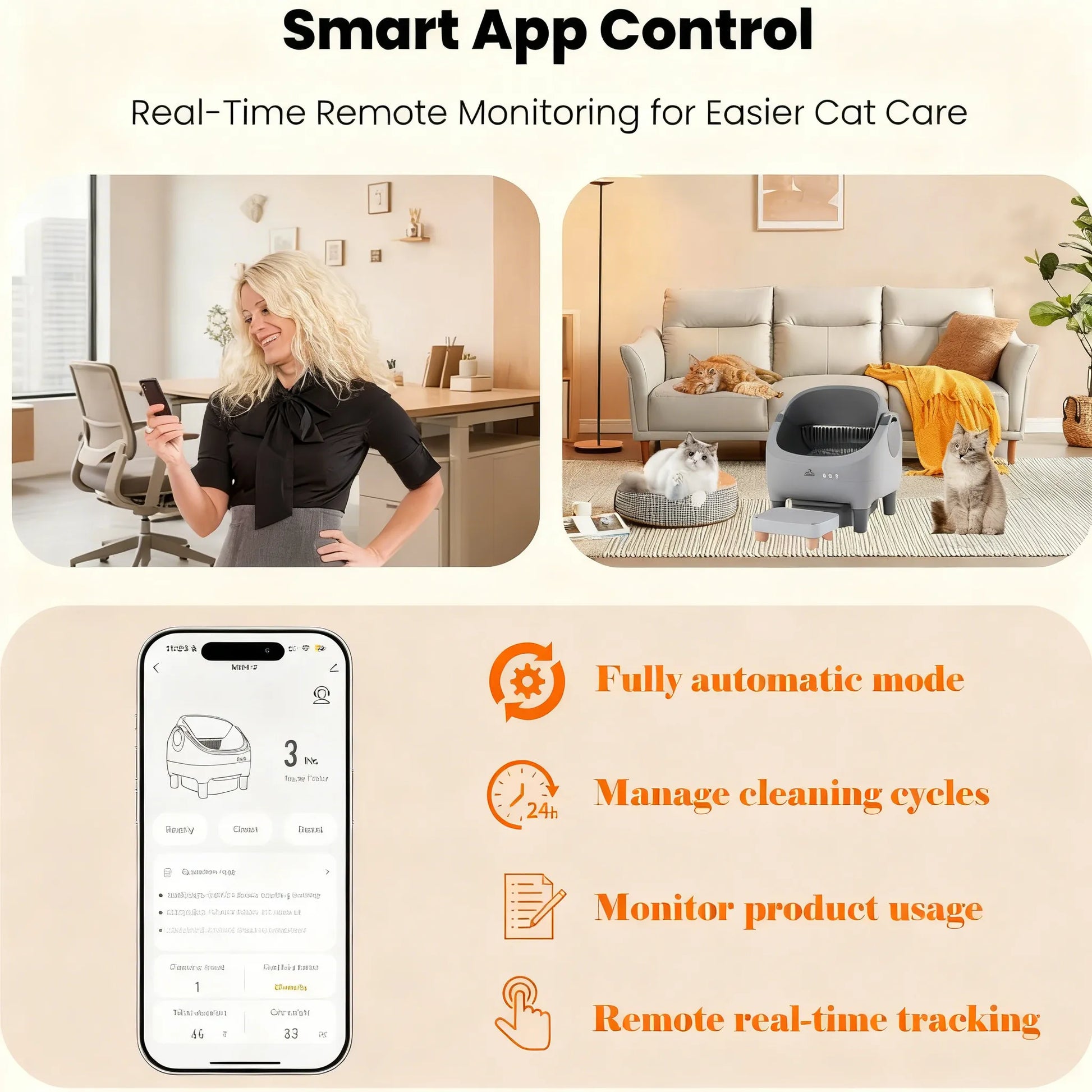 Equipped with a raised step to help your cat enter and exit easily, while trapping litter. This open-top large capacity design is perfect for multiple cats. Features smart app control, odor control, health monitoring, safety protection, quiet operation, and long-lasting durability.
